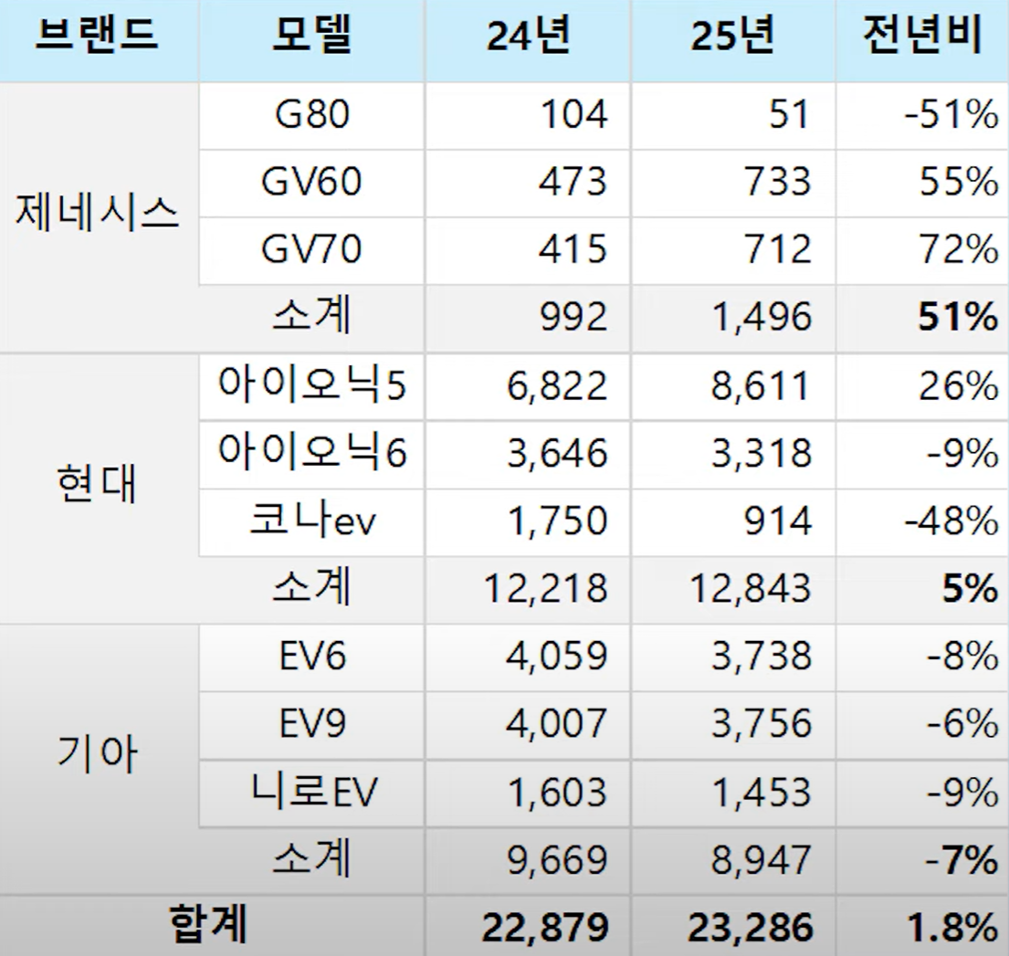 제네시스와 현대차가 증가하였음에도 기아 전기차가 7% 감소한 요인이 큽니다.