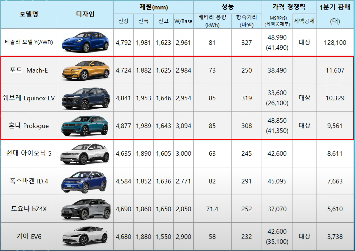 혁신 이미지의 대명사인 모델 Y를 제외하고 판매대수가 많은 포드 머스탱 Mach-e, 쉐보레의 Equiniox EV, 혼다의 Prologue의 공통 요소에는 브랜드 이미지와 일치되는 디자인과 기능, 한 단계 큰 재원, 주행거리가 긺에도 저가격을 유지하는 균형 잡힌 제품에 강점이 있다고 보입니다.