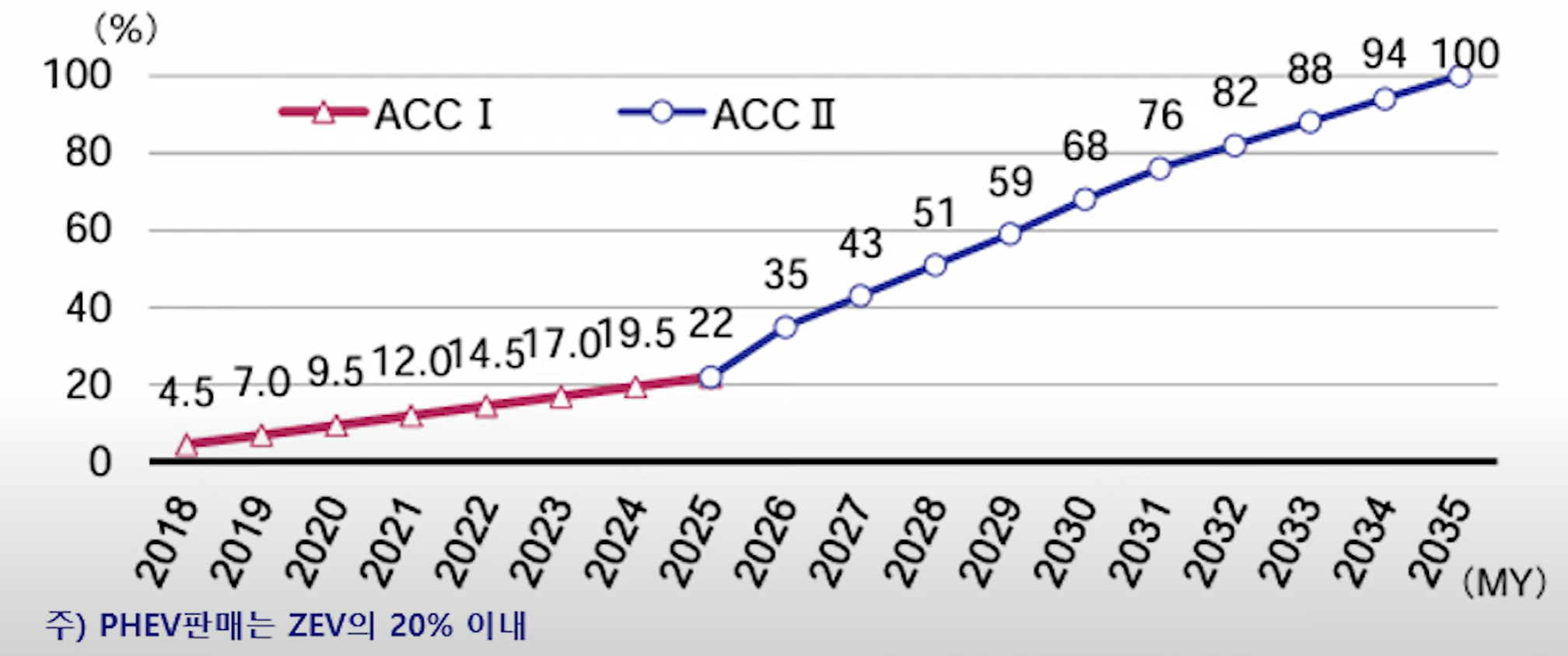 캘리포니아 ZEV 규제는 2026년 판매 모델 이후부터 전체 판매의 35%를 전기차로 판매합니다.