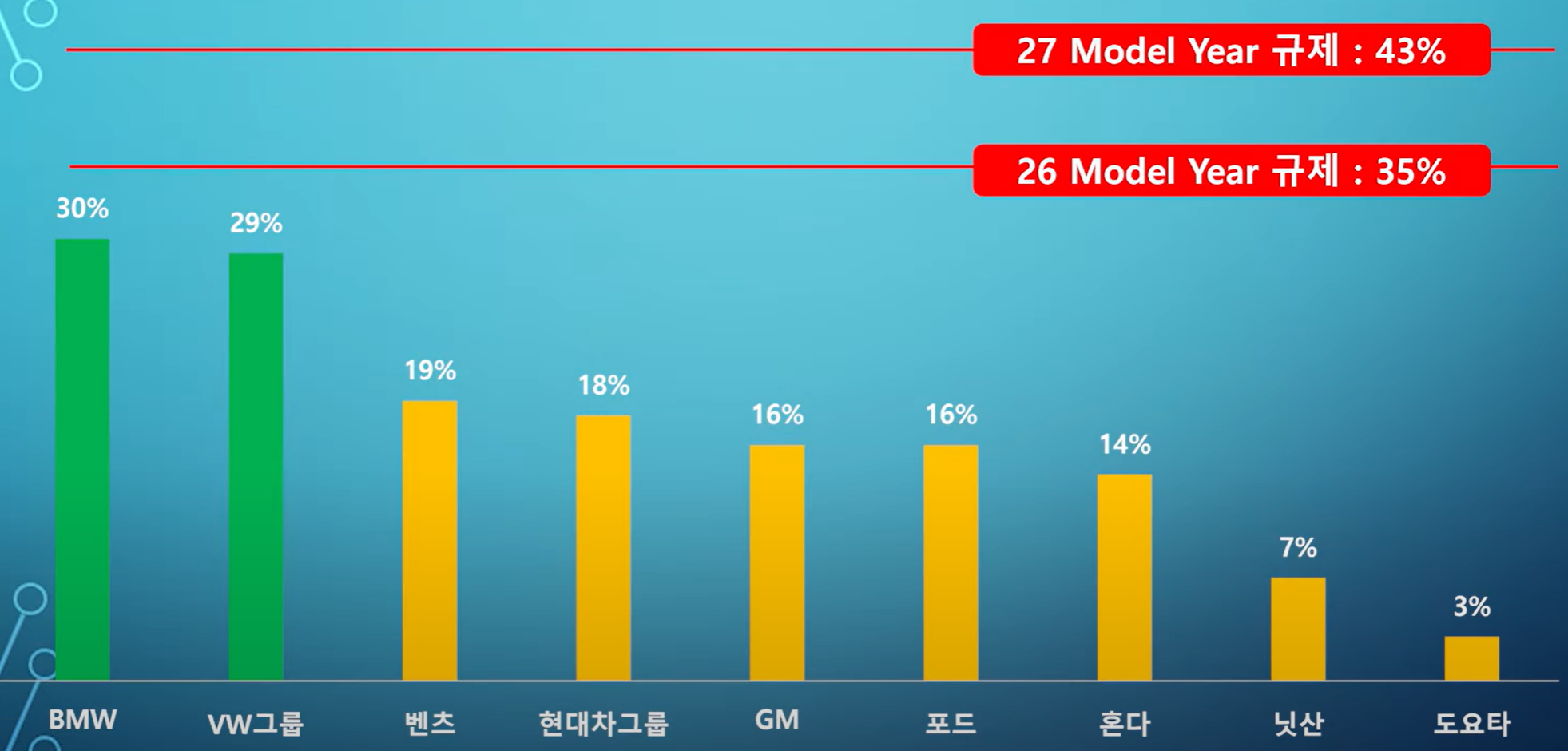 그러나 올 1분기 업체별 전기차 판매 비율은 BMW가 30%, 현대차 그룹이 18%, 도요다가 제일 낮은 3%로 벌금을 내지 않으려면 전기차를 더 판매해야 합니다.