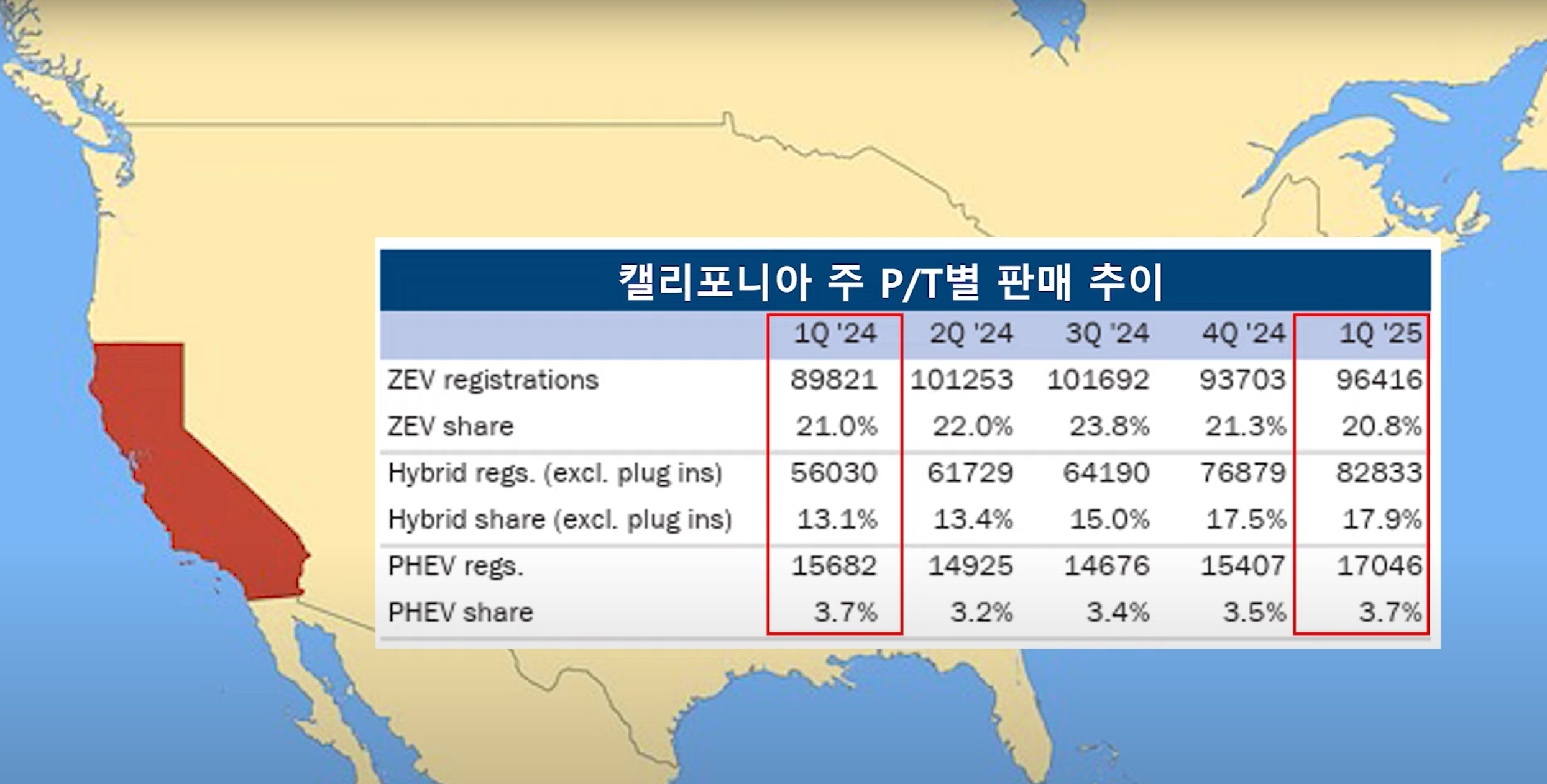 캘리포니아 주 25년 1분기 판매에서 전기차 판매 비율은 감소했지만 하이브리드 판매 비율은 13.1%에서 17.9%로 크게 증가했습니다.