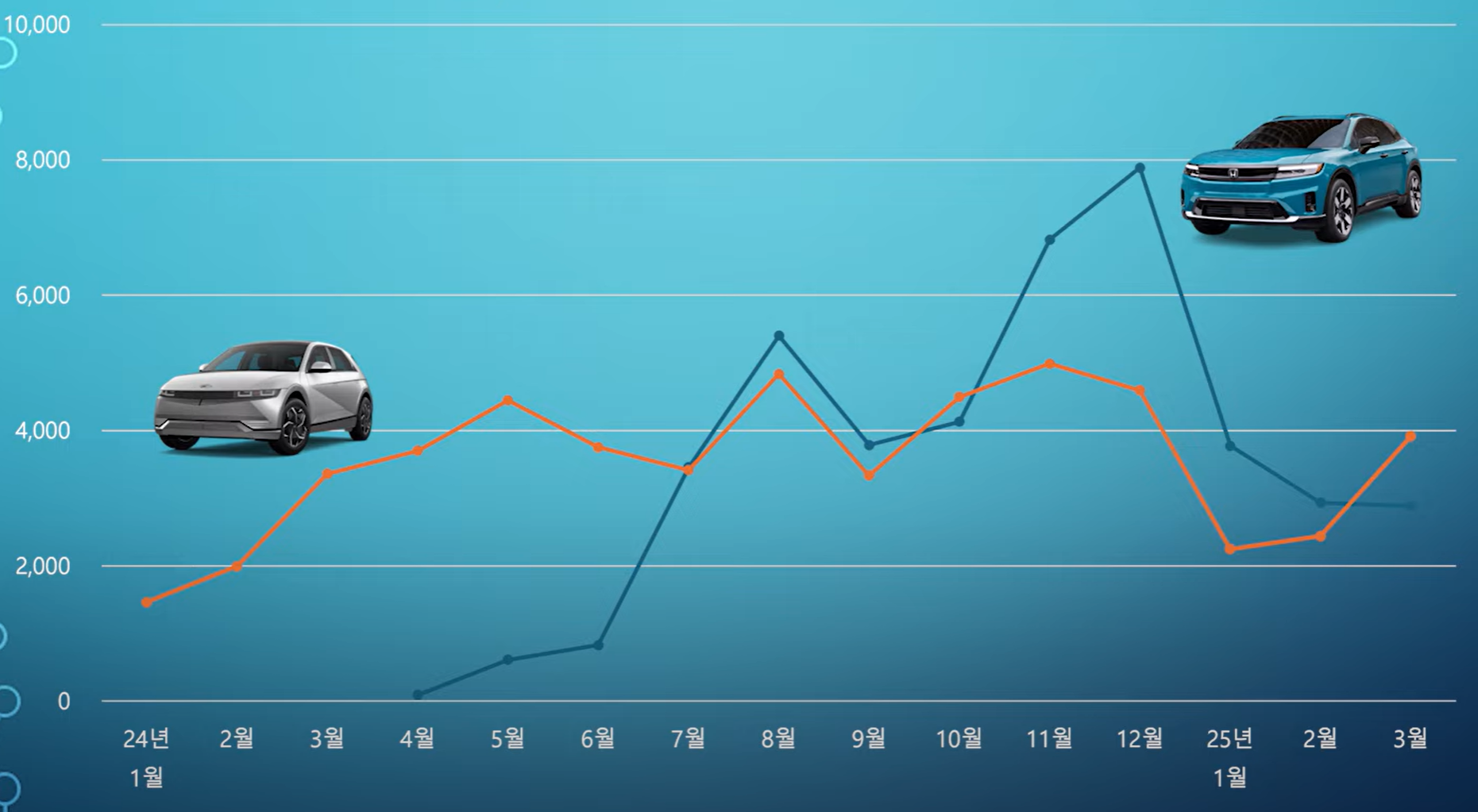 혼다의 Prologue는 현대차 아이오닉 5보다도 2년 늦은 작년 4월부터 판매했지만 론칭 4개월 만에 따라잡더니 작년 8월부터는 압도해 왔습니다.