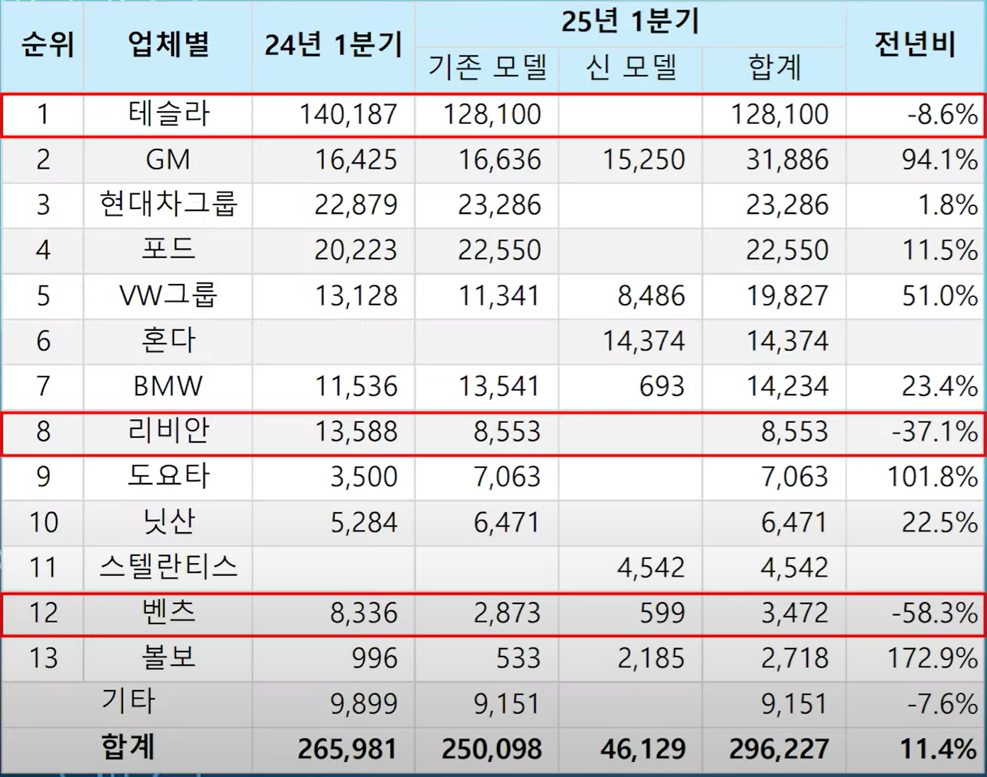 전년 동기 대비 감소한 업체는 테슬라와 리비안 그리고 벤츠였습니다.