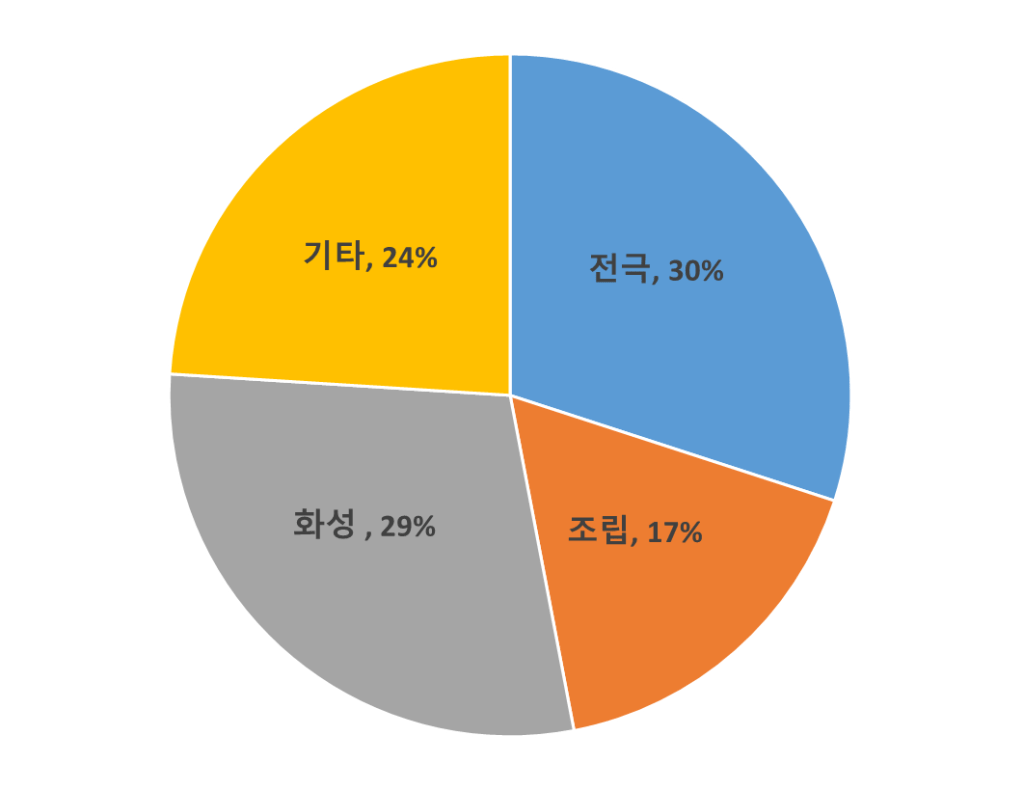 아래 그림은 각 배터리 제조 공정의 설비 투자비 비중을 나타낸 것이다. 전극과 화성 설비 투자 비중이 30%, 29%로 높다.