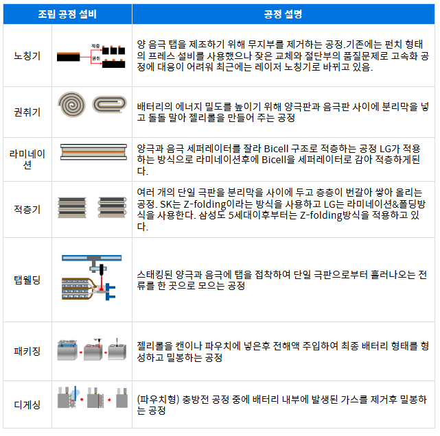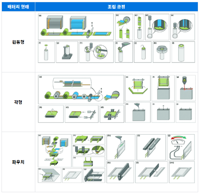 배터리 형태에 따라 아래 표와 같이 조립공정이 달라진다.