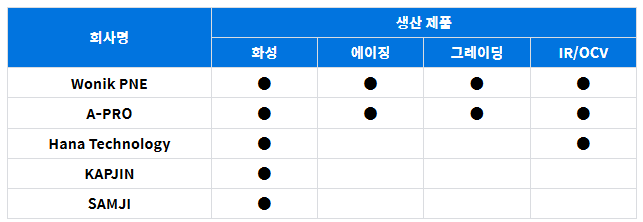 Wonik PNE는 2004년 설립되었으며 한국 내 화성 설비의 40%를 차지하고 있다. 한국 전지 3사에 꾸준히 납품을 해오고 있어 파우치뿐 아니라 각형, 원통형의 설비도 제작 가능하다. 전지 후공정인 화성 이후 공정 전 Line의 TURN-KEY 설계 및 생산이 가능하다. 특히 전기차에 사용되는 중대형 배터리에 특화된 Solution을 가지고 있다. A-PRO는 2000년 설립되었으며 화성공정에 필요한 중요 설비를 생산하기는하지만 Turnkey생산은 아니다. 생산하는 95%의 제품을 LG에 납품하고 있어 기술력이 파우치 제품에 치우쳐져 있다.