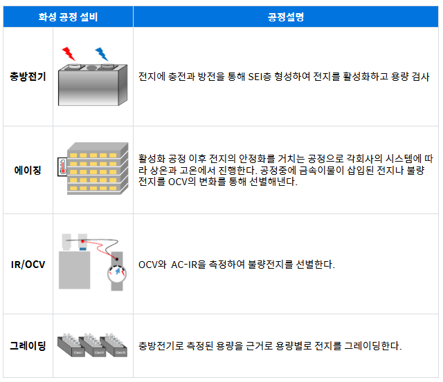 화성 공정은 조립된 배터리에 전기적 특성을 부여하고, 결함 여부를 파악하는 마무리 공정이다 .리튬 이온 배터리 라인 투자 비용의 약 29%를 차지하며 배터리의 형태에 따라 설비의 설계가 변화될 수있다.