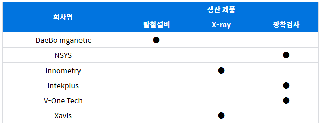 DaeBo magnetic는 배터리 소재에 함유된 철(Fe)을 제거하는 탈철기 제조업체다. 리튬광산과 전구체, 양극재, 음극재, 배터리 제조업체에 탈철기를 공급한다. 지역별 매출 비중은 중국이 70~80%, 기타 해외 10% 미만, 한국이 10~20% 수준이다. 한국 배터리 3사뿐 아니라 중국 내 CATL,CATL, BYD에 공급하고 있으며 최근에는 Tesla도 공급하고 있다. NSYS는 전극, 조립 화성 전공정에 걸쳐 불량을 검사하는 광학 설비를 생산하고 있다. Innometry, Xavis는 배터리 내부 defect와 양음극 overhang을 검사하는 X-ray장비를 생산한다.