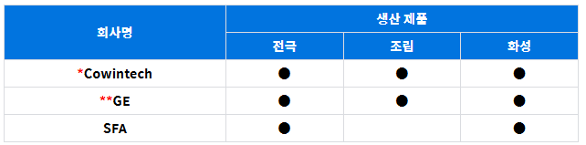 Cowintech은 1998년 설립되어 배터리 전공정 자동화 시스템을 Turn key로 납품하고 있으며 공정의 무인 자동화를 위한 AGV관련 개발을 지속하고 있다. GE는 Cowintech와 마찬기지로 배터리 전공정 자동화 시스템의 제조가 가능하다. Ultiumcells의 자동화 물류 공급자로 선정되었다.