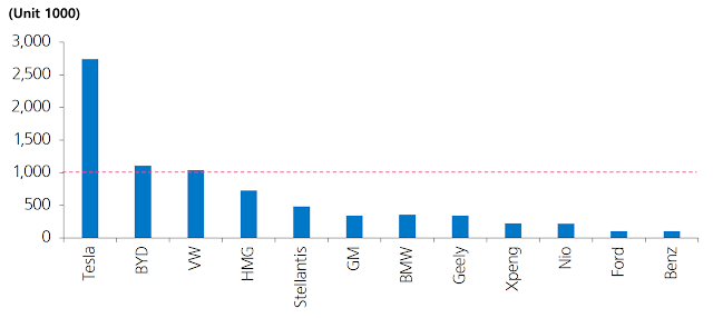 2015년 2022년 상반기 기준 테슬라의 누적 판매 대수는 2.7백만 대로 가장 앞서고 있고 BYD 와 VW이 1백만대 판매에 도달했다. 현대기아차는 2023 년 하반기에, GM과 포드는 2024년에 누적 1백만대 판매를 넘어설 전망이다