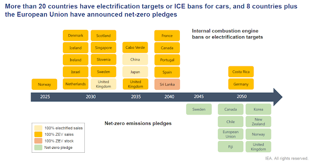 미국에서는 조 바이든 대통령이 보다 엄격한 배출가스 배출규제에 중점을 두고 파리 협정에 재가입했으며 캘리포니아의 경우 휘발유 및 디젤 차량의 신차 판매는 2035년까지 금지할 계획이라고 발표했다. 15개국 이상이 휘발유및 디젤 차량의 신차 판매를 단계적으로 폐지하겠다고 발표했는데 최근 보고서들을 보면 이러한 목표의 대부분이 충족될 것이라고 예상된다.