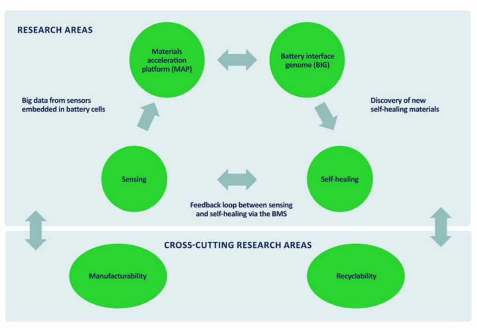 6개의 연구 분야는 독립적이지 않고 위 그림과 같이 서로 상호작용을 한다. – 새로운 재료를 발굴하고 인터페이스 구축을 위해 활용되는 배터리 인터페이스 게놈(BIG), 재료 가속 플랫폼(MAP)은 자가복원 재료와 화학 물질을 발굴하고 최적화하는데도 적용되어 설계와 생산, 재활용에 활용될 것이다. – 셀의 상태를 모니터링하고 진단하는 센서는 대량의 데이터를 제공하며, 이러한 데이터는 MAP에서 사용되는 AI에 제공되어 체계적으로 축적된다. – 센싱과 자가 복원 기능은 BMS를 통해 긴밀히 연결되고, BMS는 센서를 통해 수집된 정보를 기반으로 자가 복원을 실행한다