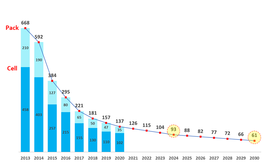 아래 그림과 같이 배터리 팩의 평균 비용은 2020년 $150/kWh 미만으로 떨어졌다. 이는 2019년 후반에 예상했던 것보다 $20낮다. 가격 급락은 주로 전지 소재와 팩 조립의 혁신, 생산규모의 증가 및 제조 공정의 개선 등으로 가능해졌다.