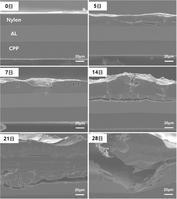물리적으로 파손된 경우에는 제조현장에서 육안검사를 통해 폐기할 수 있지만 화학적인 손상은 바로 발견되지 않고 시간이 일정한 반응시간을 거친 후 발견되기 때문에 제조 공정 중에 화학적인 손상에 의한 불량을 걸러내는 것이 중요합니다. Al포일층이 부식하는 요인에는 외부층인 Nylon층의 손상에 의해 발생하는 경우와 내부층인 CPP층의 손상되어 발생하는 두 가지 경우가 있습니다.