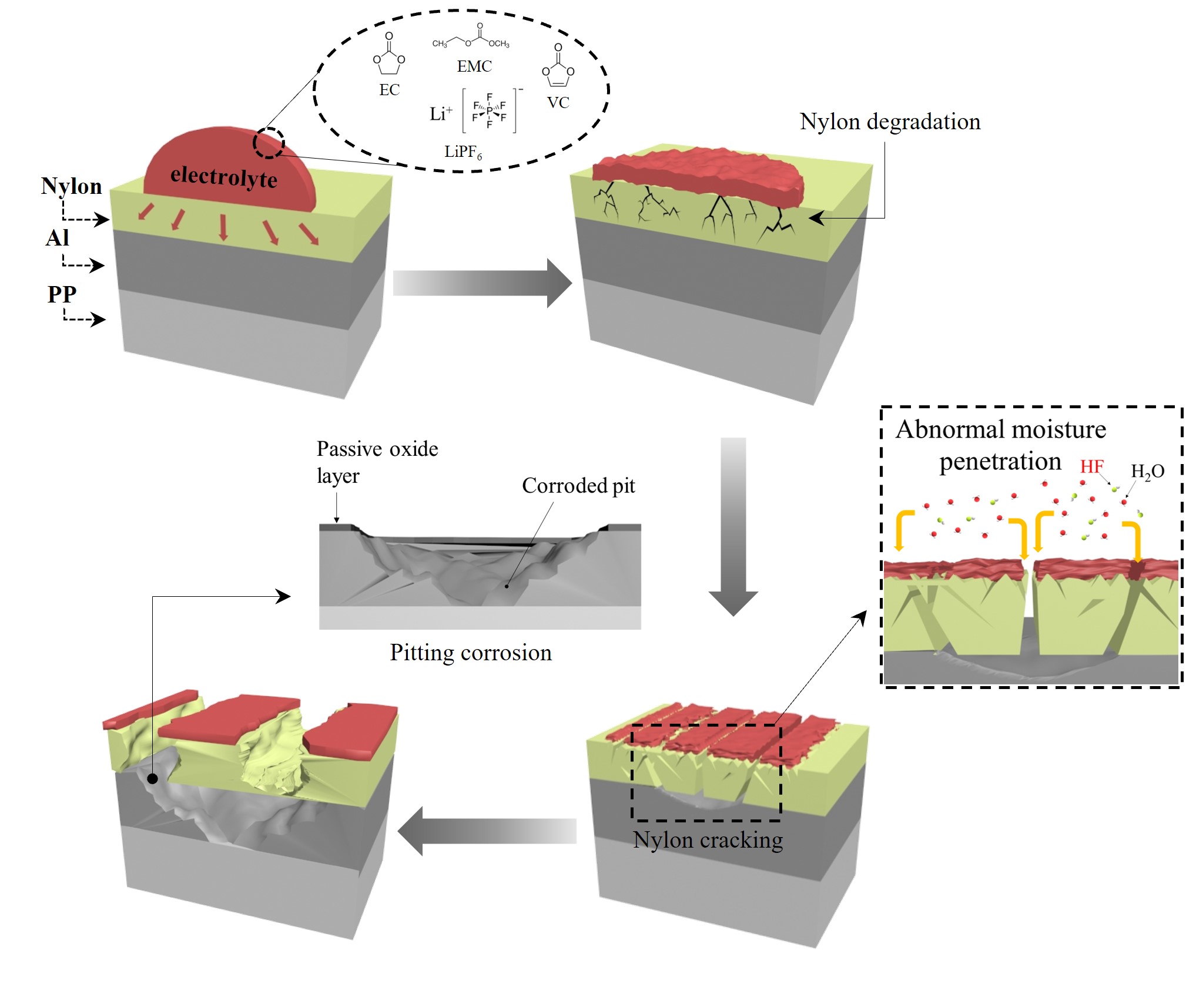 그림 3 고온 고습 환경하에서 전해액이 파우치를 부식시키는 메커니즘 나일론 필름의 화학적 손상은 표면과 내부에 미세 기공을 형성하여 대기 수분이 침투하는 통로를 형성하게 됩니다. 시간이 지남에 따라 이러한 미세 기공은 심각한 균열로 발전하여 결국 나일론 필름을 완전히 파괴할 수 있습니다.