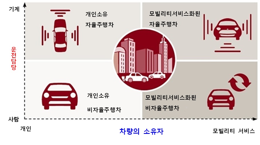 카셰어링과 라이드 헤일링의 2가지 모빌리티 서비스 형태는 도시에서 주로 이용될 것으로 예상된다. 자율주행차는 사고 방지에 도움을 주고, 교통체증도 완화하기 때문에, 도시에서의 운송 인프라의 효율을 높이고, 교통량의 증가를 흡수한다. 도시에 살면서 개인 소유 자율주행차를 운행하는 사람들은 주로 자동차를 소유하여 자신의 지위를 나타내는 상징으로서 삼고자 하는 사람들일 것이다. 이런 부류의 사람들을 위해 여전히 럭셔리 자동차 시장은 미래에도 존재할 것이다.