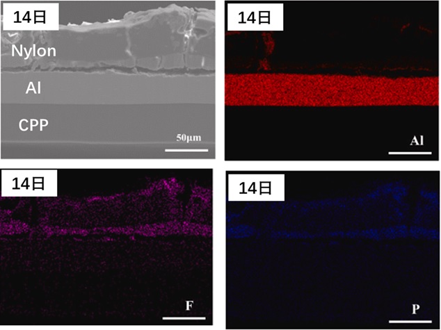 5일이 지난 시점의 단면을 보면 금속염이 나일론의 결정도를 감소시켜 나일론 필름 내부에 기공을 생성시키는 것을 발견할 수 있다. 7일 후 얻은 단면 이미지를 보면 이러한 기공이 나일론 필름의 국부적으로 손상된 부분을 통해 알루미늄 필름에 도달한 것을 볼 수 있습니다. 14일 후에는 나일론 필름 내부의 균열이 심해져 알루미늄 필름을 노출시키고 국부적으로 노출된 알루미늄 필름은 더 이상 나일론에 의해 대기로부터 보호되지 않기 때문에 심하게 손상되기 시작합니다. 21일 후에는 알루미늄 박막이 국부적인 부식으로 초기 조건에 비해 두께가 1/4로 감소하였습니다. 28일 후에는 나일론 필름이 완전히 벗겨지고 노출된 알루미늄 박막이 심한 부식에 의해 완전히 천공되어 있음을 분명히 알 수 있습니다. 알루미늄은 강한 산성 또는 염기성 환경에서 부식되기 쉽습니다. 강한 산성물질인 HF는 Al 파우치의 나일론 필름이 전해질로 오염되었을 때 전해질의 금속염인 LiPF6가 대기 수분과 함께 가수분해 반응을 일으킬 때 형성될 수 있습니다. 생성된 HF는 나일론 필름이 파손된 후 알루미늄 박막에 쉽게 도달할 수 있습니다. 그림 5는 고온 고습 환경에서 14일 방치한 후 EDS매핑을 한 것이다. 나일론 필름에 인(P)과 불소(F)를 확인할 수 있는데 이는 대기 중의 수분과 만난 LiPF6가 가수분해 반응에 의해 HF가 생성되고, 나일론 필름에 생긴 기공으로 HF와 인산이 침투되었기 때문이라고 볼 수 있다. 이렇게 침투된 HF와 인산은 알루미늄 필름의 산화알루미늄 층을 용해시키고 알루미늄 부식을 진행시켜 결국엔 파우치 배터리 내부로 수분과 공기를 침투시켜 배터리의 성능을 열화 시킨다.