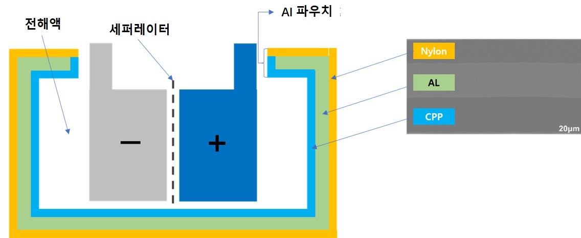 이번에는 Al 파우치 내층인 CPP층의 손상에 의한 Al층의 부식을 설명하려고 한다. 아래 그림은 일반적인 파우치 배터리의 개략적인 그림이다.
