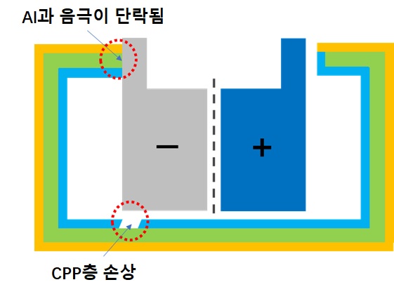 내층인 CPP층의 손상으로 Al층이 부식되려면 아래 두 가지 조건이 충족되어야 한다. – 파우치의 Al층이 배터리의 음극과 단락이 되어야 한다. – 내층인 CPP층이 손상되어 전해액과 Al층이 접촉해야 한다. 이 두 가지 조건중 어느 한쪽만 충족되지 않아도 Al층의 부식은 일어나지 않는다. 아래 그림은 위의 두가지 조건이 발생한 모습을 나타낸 것이다.