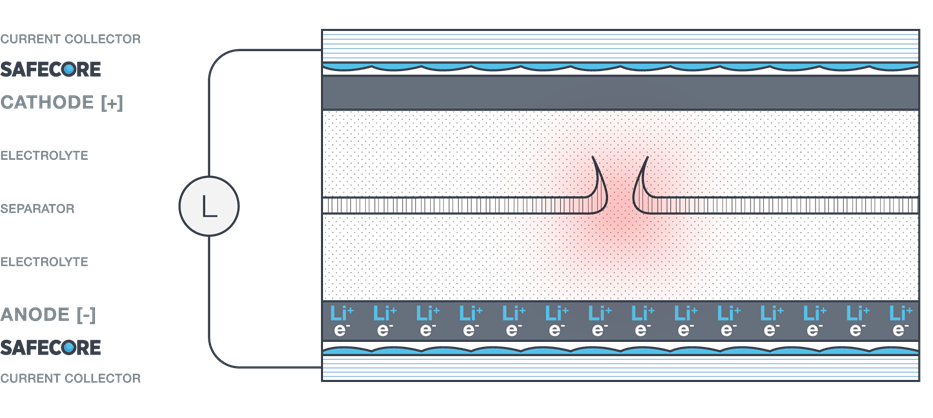 Safecore는 아래 그림과 같이 전극과 집전체 사이에 위치하여. 배터리가 과충전, 내부 단락, 충격등으로 온도, 전압, 전류가 임계값을 넘어서게 되면 PTC역할을 하는 Safecore가 집전체와 전극사이에 간격을 만들어 내어 내부저항을 증가시킵니다. 증가한 내부저항으로 전극에 저장된 에너지가 한꺼번에 방출되지 않게 되므로 열폭주가 발생하지 않게 됩니다.